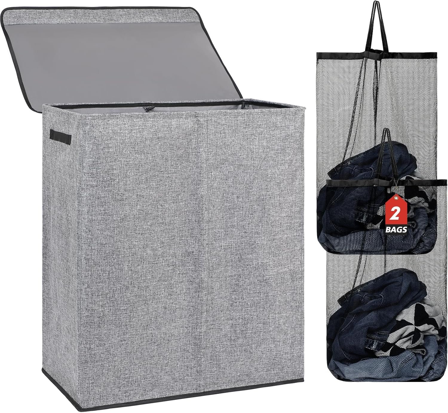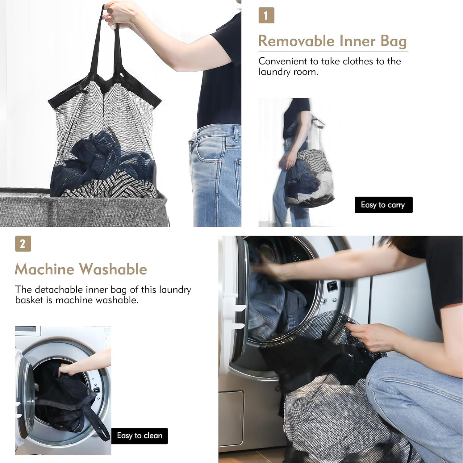 【Dual Compartment Design】 The grey laundry basket with lid features two removable bags, making it easy to sort and organize dirty clothes, ensuring a neat and tidy setup for any room.