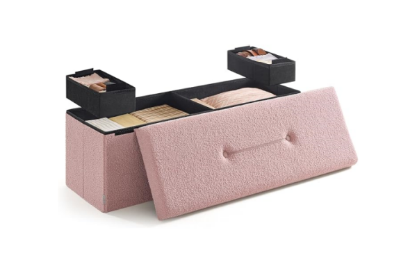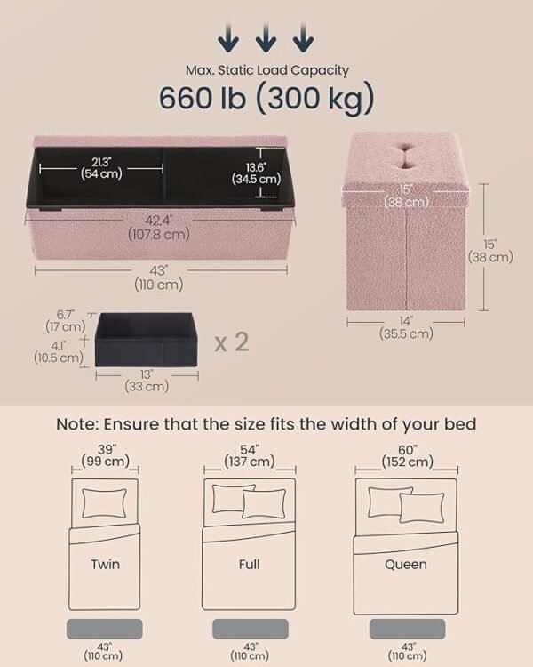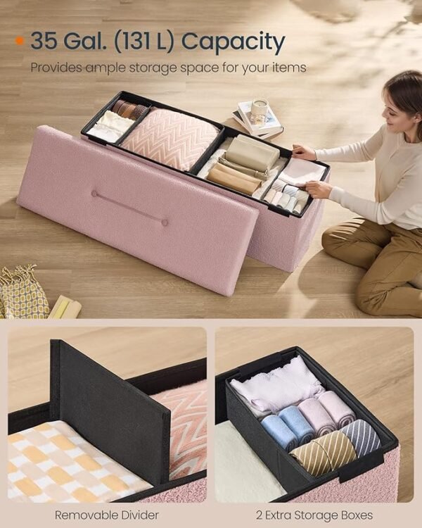 【Ample Storage】Measuring 15″D x 43″W x 15″H (38 x 110 x 38 cm), this modern ottoman bench offers 35 gallons (131 L) of storage. Two extra boxes and a removable divider help with organization.