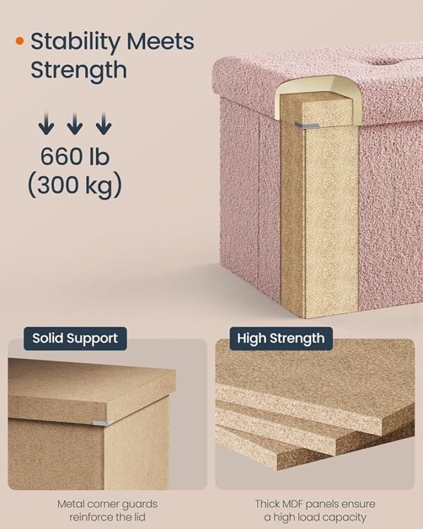 【Sturdy and Durable】Made with premium MDF panels and reinforced with metal corner guards, this modern ottoman bench supports up to 660 lb (300 kg), offering a strong, reliable seating or storage solution.